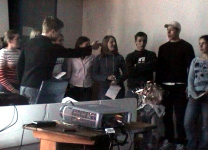 Treffen der drei beteiligten Projektklassen. Die Arbeitsgruppen trafen