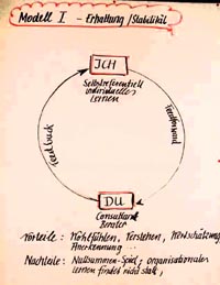 Diesem Modell liegt die Grundhaltung zugrunde, dass es in der Kommunikation wesentlich ist, den anderen anzunehmen, ihm das Gefühl zu geben, man habe ihn verstanden. Das Ich hegt eine ganz bestimmte Erwartungshaltung (feedforward), die durch nonverbale Signale dem Du ziemlich deutlich nahe gebracht wird. Diese Erwartungshaltung lässt sich in etwa auf den Satz reduzieren: Ich sage dir etwas und möchte etwas von dir erfahren, aber du sollst mir nicht weh tun dabei. Das Du geht auf diese Erwartungshaltung ein, es hat gelernt, dass es nicht gut ist, dem anderen weh zu tun: Ein dementsprechendes Feedback wird gegeben. Die Grundannahme in diesem Modell ist, dass das Du lernen soll, das zu spüren, was der andere erwartet, und gewissermaßen die Pflicht hat, angemessen darauf zu reagieren. Vorteile dieses Kommunikationsmodells sind: Das Ich fühlt sich wohl, verstanden, angenommen. Es gibt Wertschätzung, Anerkennung. Es herrscht ein harmonisches Verhältnis zwischen Ich und Du. Dieses Modell hat jedoch auch Nachteile: So verlangt dieses Kommunikationsmodell beispielsweise die Wiederholung der Aussage des anderen: „Du fühlst dich also nicht heute nicht wohl?“ Hier offenbart sich eine wesentliche Schwäche: Das Ich erhält nur das zurück, was es hinein gegeben hat. Das Modell ist selbstreferentiell, ein Null-Summen-Spiel. Die Kommunikation läuft sich zu Tode, ein Lernen ist kaum möglich, aber wir fühlen uns wohl dabei. Zusammenfassend also lässt sich daher sagen, dass organisationales Lernen in diesem Modell nicht oder nur selten stattfindet. Das bedeutet aber nicht, dass Modell 1 völlig unbrauchbar wäre. Im Gegenteil, es bildet die Basis der Kommunikation, reicht aber allein noch nicht aus. Um bestimmte Probleme zu lösen, braucht es mehr. Mit diesem Modell gibt es nämlich keine Offenheit in einer Organisation: Ein Verstoß gegen die Grundregel des „Tu-mir-nicht-weh“ würde nämlich in den meisten Fällen dazu führen, dass die Beziehung gefährdet ist. Das Du dieses Modells hat also gar nicht die Möglichkeit, offen zu antworten, solange vom Ich diese Botschaft ausgesandt wird. Freilich ist die Voraussetzung für Offenheit ein gewisser Rahmen: Nur das sollte „aufgemacht“ werden, was auch wieder friedlich geschlossen werden kann. | |||