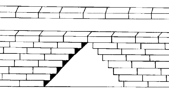 Der Kragbogen gleicht zwei Treppen, die sich in der Mitte treffen. Die Steine liegen so übereinander, dass jede Reihe etwas weiter vorsteht.