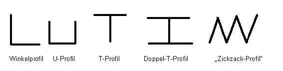 Für Stahlkonstruktionen verwendet man z.B. gewalzte Profile in Form von Winkel-, T-, Doppel-T-, U- und Rohrprofilen.