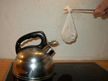 An dem kalten Beutel bildet sich ein Niederschlag, der in der Form von Regen zur Erde fällt.