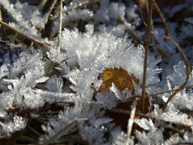 In der kalten Luft wird der Wasserdampf wieder zu kleinen Tröpfchen. Diese gefrieren an der kalten Wand des Bechers zu Eiskristallen.