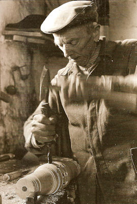 Der grob zugesägte Nabenklotz wird auf der Drechselbank in die richtige Form gebracht. |