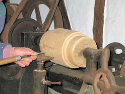 Auf der Drechselbank wurde die grobgehauene Radnabe eingespannt und mit dem Meißel gedreht.