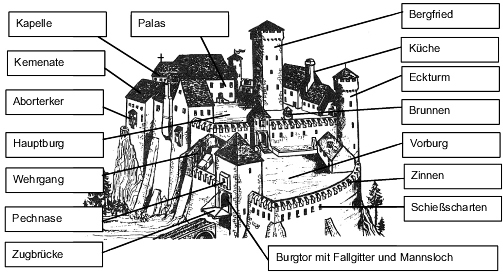 Bei einer Belagerung musste die Burg sich selbst versorgen können. Auf den hohen Mauern konnte er die Schießscharten, Zinnen und Wehrgänge erkennen.