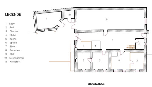 Charakteristisch ist ein in Stein gemauertes unverputztes Kellergeschoß, der als Lagerraum verwendet wurde.