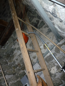 Da gehen viele Leitern zum Turm hinauf. Da ist auch ein Seil, da muss man ziehen, dann läutet es.