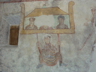 | In der Kirche zeigte uns Heinrich ganz alte Freskenbilder. Er erklärte den Kindern, dass der Maler dieser Bilder damit Geschichten erzählen wollte. |