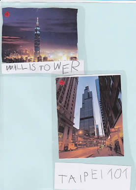 Der zweite Turm ist bei den Pandabären in China. Mein Turm auf der Postkarte ist New York. Das ist in Amerika.