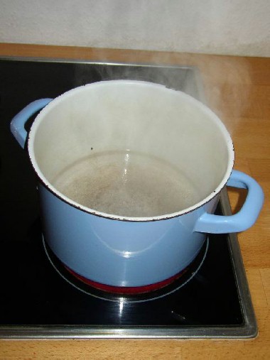 Das Wasser verschwindet allmählich. Schließlich ist kein Wasser mehr im Topf. Wenn die Kochplatte heiß ist, kann man über dem Topf Neben aufsteigen sehen.