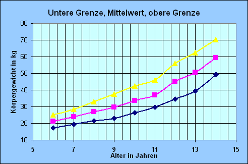 | Alter (in Jahren) | von … kg | Mittelwert | bis … kg | Alter in Jahren | von … kg | Mittelwert | bis … kg | |||||