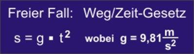 | Fall-Zeit in Sekunden | Zeit zum Quadrat | Erdbeschleunigung g | Fall-Weg in Meter | Zusammenhang | ||||||||