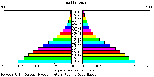 "The population of Mali was approximately 11.7 million in 2005. Sixty-five per cent of the population is under 25 years of age, and 73 per cent of the population lives in rural areas. Life expectancy at birth is 62.2 years for women and 58.8 years for men. The annual population growth rate is 2.9 per cent, and the population doubles every 24 years. Sixty-three per cent of Malians live below the poverty line, and 22 per cent live in extreme poverty." |