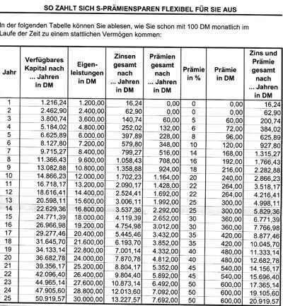 Beim Prämiensparen wird regelmäßig (etwa monatlich) ein fester Betrag eingezahlt und im Sparvertrag geregelt, dass die Gelder über einige Jahre (etwa 10 Jahre oder mehr) nicht abgehoben werden können (sei denn mit Verlust!). Dafür gibt die Sparkasse oder die Bank dann neben den Zinsen in der Regel jährlich noch eine Prämie, die mit den Jahren ansteigt. |