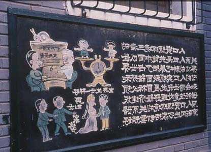 Eine Tafel in Peking sagt: Alle Menschen sind gleich. Frauen und Männer, Mädchen und Jungen, Büro- und Fabrikarbeiter