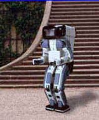 "Not a man in a spacesuit, but a self-contained research robot developed over a decade by a group of thirty engineers at Honda Motors of Japan, perhaps as a hedge against future reverses in the automobile market. The ``backpack'' contains power and computing. The machine has fully functional arms and camera eyes, and can find stairs and move objects. Its most advanced skill, so far, is walking, on flat and sloped ground, and up and down stairs. It is as humanlike in its motion as in its appearance. If pushed, it shifts its posture or begins to walk to keep equilibrium. ...."