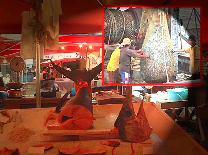 Computergrafik: Foto vom Fischmarkt in Cantania - eingeblendet eine mögliche Herkunft