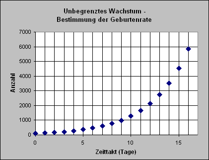 Wir nehmen die Sterberate halb so groß wie die Geburtenrate an, weil die Spinnmilben eine Lebensdauer von etwa 14 Tagen haben. Das ist das Zeitintervall indem aus 100 Milben 3000 neue entstehen. |