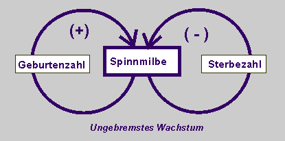 Das zweite Wirkungsdiagramm zeigt, dass die zunehmende Anzahl der Spinnmilben auch positiv auf die Geburtenzahl zurückwirkt. Denn je mehr Spinnmilben leben, desto mehr Geburten wird es geben. Das Wachstum der Spinnmilben ist über die Geburtenzahl positiv rückgekoppelt.