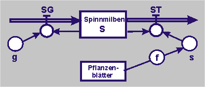 Anmerkung: Die Pflanzen könnten auch als eine weitere Zustandsgröße definiert werden, die in Abhängigkeit vom Wachstum der Spinnmilben steht. Dann hätten wir ein ähnliches Modell, wie es auf der nächsten Seite beschrieben wird. |