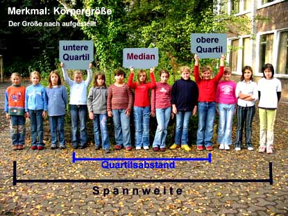 Ein Beobachtungswert heißt oberes Quartil, wenn mindestens 25% aller Beobachtungswerte größer oder gleich sind als dieses obere Quartil. Entsprechend heißt ein Beobachtungswert unteres Quartil, wenn mindestens 25% kleiner oder gleich sind als das untere Quartil. (siehe: obiges Bild) |