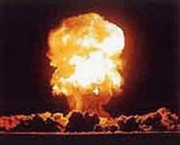 Eine gebremste Umwandlung von Masse in Energie findet in Atomkraftwerken und eine ungebremste in der Explosion einer Atombombe oder beim Durchbrennen eines Atiomreaktors statt. Die "freundliche" Kernfusion, in der ebenfalls Masse in Energie gewandelt wird, findet auf der Sonne statt. Diese Energie kommt uns auf der Erde in Form von Wärme und Licht (Photosynthese) zu Gute. |