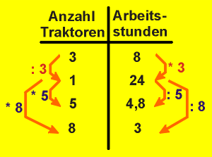 Wir nehmen an: 3 Traktoren brauchen 8 Arbeitsstunden, um ein Feld zu pflügen.