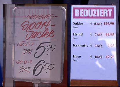 - dass eine Sportjacke von 7.95€ auf 5.95€ herunter gesetzt worden ist oder