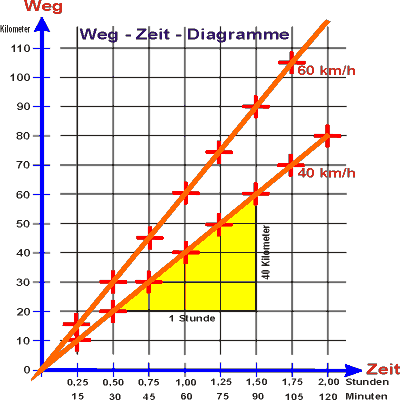 In diesen Grafen stellen die Reziprokgrößen der Geschwindigkeiten, nämlich 1/40 h/km (= 0,025 h/km; also 0,025 Stunde pro Kilometer) oder 1/60 h/km (= 0,0166.. h/km), die Steigung der Geraden dar. |