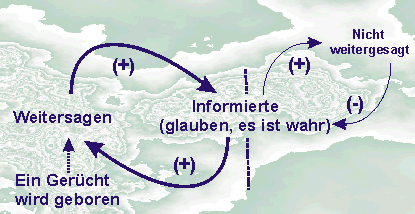 In der Schule tuscheln einige Jugendliche miteinander: " Morgen gibt es schulfrei, hi,hi ...". Wer diese Nachricht das erste Mal hört, glaubt daran und gibt sie an Andere weiter. Die Nachricht verbreitet sich. Das Gerücht zieht von Klasse zu Klasse weiter. Und schließlich weiß niemand mehr, ob es wahr ist oder nicht. Sobald allerdings jemand die Nachricht ein zweites Mal hört, wird er stutzig und gibt das Gerücht nicht mehr weiter. |