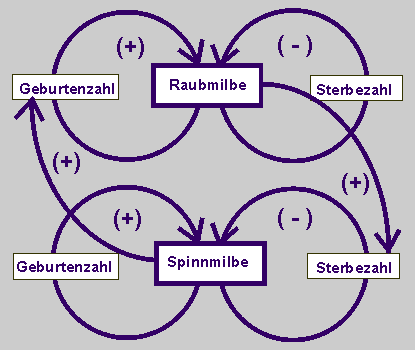 Zur quantifizierten Beschreibung des Wachstums von Spinnmilben und Raubmilben (hierzu siehe: Dynamische Modelle zur Bevölkerungsentwicklung) kommen nun die Wirkungen aufeinander hinzu.