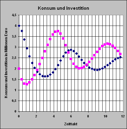 Der Zweck des Modells kann also genau diese qualitative Erkenntnis sein: Konsum und Investition schwingen zeitversetzt und gegenläufig immer zeitlich etwas nachhinkend.
