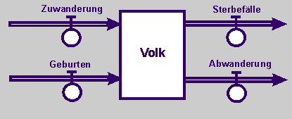 Bei Vernachlässigung der Größen Fruchtbarkeit und Sterbeziffer kann das Wirkungsdiagramm auch wie folgt aussehen: Es besteht aus zwei Rückkopplungskreisen. Der eine ist positiv. Je mehr Menschen leben, umso mehr Kinder werden bei gegebener Geburtenrate geboren. Der andere Rückkopplungskreis ist negativ. Je mehr Menschen leben, umso mehr werden sterben, bei gegebener Sterberate. |