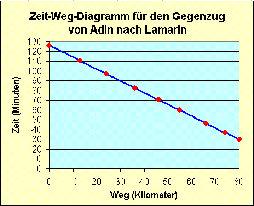 Werden die Diagramme für den Zug und seinen Gegenzug in derselben Weise formatiert, so lassen sich die Graphen übereinander legen. Dann sieht man, dass sich die Geraden am Kilometer-Ort Fiora schneiden. |