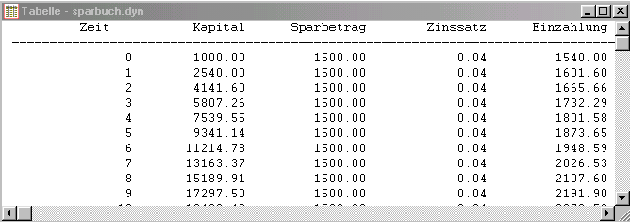 Das Zinseszinsen-Modell kann dann unter unterschiedlichen Bedingungen für Anfangskapital, Zinssätze und Sparbeträge "gefahren" bzw. simuliert werden.