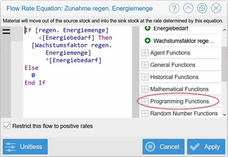 Wie Ihr seht, haben wir bei der Definition der Wachstumsrate für die Zunahme der regenerativen Energieträger etwas neues ausprobiert: Eine IF THEN ELSE Abfrage.