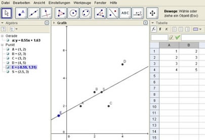 Wenn die vier Punkte A,B,C und D heißen, so gebt ihr nun S=(A+B+C+D)/4 in die Eingabezeile ein. Ihr habt nun den Punkt S konstruiert, dessen x-Koordinate der Durchschnitt aller x-Koordinaten und dessen y-Koordinate der Durchschnitt aller y-Koordinaten von A, B, C und D ist. Dieser Punkt liegt immer auf der Ausgleichsgerade.