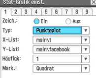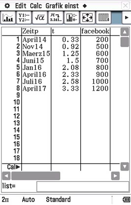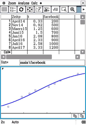 | Unsere Modellierung geht von einem Maximal(Sättigungs-)wert aller Nutzer des Facebook-Messengers aus, der ungefähr bei 1,35 Mrd. liegt. Renditeverwöhnte Wertpapieranleger könnte dies abschrecken und dies könnte möglicherweise in der Folge zu einem Wertverlust bei den Aktien führen. Schauen wir uns die vorgegebenen realen Werte an, liegt die Vermutung nahe, dass eine Modellierung durch ein Gerade, die immerhin ein konstantes Wachstum verspricht, der Situation angemessener sein könnte. Das wollen wir nun mit dem ClassPad überprüfen. |