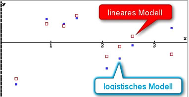 In der nebenstehenden Tabelle sind diese Abweichungen (Residuen) sowohl für das logistische Modell (ResLogM) als auch für das lineare Modell (ResLinM) aufgelistet. |