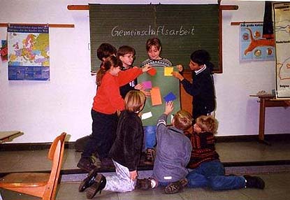 Alle Methoden des gemeinsamen Planens, Anwendens und Strukturierens, also z.B. auch die Gruppenarbeit, müssen dadurch gelernt werden, dass - unter Moderation von Lehrpersonen - Aufgaben und Probleme in Zusammenarbeit gelöst werden und dabei gleichzeitig auch Kompetenzen in der Verständigung untereinander erworben werden. Teamarbeit kann man nicht instruieren. Teamarbeit kann nur durch Teamarbeit gelernt werden. Sie muss erlebt und eigenaktiv erfahren und verbessert werden. Es ist zu empfehlen, die Zusammenarbeit zunächst in der Klasse und dann international zu üben. | ||||||