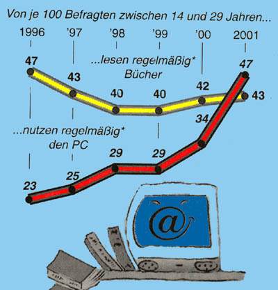 Gehen wir davon aus, dass zunehmend mehr Werkzeuge zur Informationserschließung sowie zur Verarbeitung von Texten, Bildern und Tönen eine allgemeine Verbreitung finden und immer mehr "hypermediale Texte" im Fernsehen, im Internet oder auf CD-ROM's angeboten werden, dann reichen in Zukunft die bisher geübten Schreib- und Lesefertigkeiten nicht mehr aus. | ||||