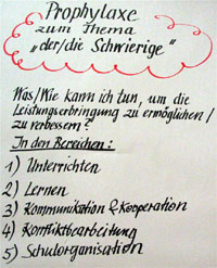 " Belastungsgrenze durch humanere Stundenrhythmen prophylaktisch optimieren = Konflikte reduzieren " Fühlen - denken - wollen - abstraktes Gestörtsein " Beobachtungen analysieren: Selbstanalyse - Situationsanalyse (z.B. anonyme Fragezettelchen) " Klärende Gespräche (unmittelbar!) " Gemeinsame Lösungsstrategien erstellen " Eventuell bei "Härtest"-Fällen zusammen mit Mediator (von außen, Spezialist!) " Wirklich tun und umsetzen | |||