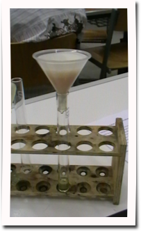 The mixed tomato liquid is in the funnel with the filter. The filtered liquid drops into the test tube.