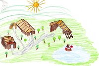 | So könnten ungefähr eine Wikingersiedlung ausgesehen haben. Im Mittelpunkt ist das Langhaus, in dem die Familie wohnt. Es bestand aus einem großen, langen Raum, und hier wurde geschlafen, gekocht, gegessen und auch gearbeitet. Im Lagerhaus bewahrte man Getreide und andere Nahrungsmittel auf, aber auch Geräte. In der Schmiede stellte man Waffen und Werkzeuge her. Die Wikinger waren hervorragende Seeleute, deshalb bauten sie ihre Siedlungen gerne in der Nähe eines Gewässers. Von dort aus fuhren sie dann mit ihren Wikingerschiffen auf das Meer zum Fischfangen. Um Handel zu treiben oder um fremde Siedlungen und Städte zu überfallen und zu plündern brauchten sie eine gute ausgebildete Mannschaft. |