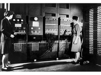 | ENIAC = Electronic Numerical Integrator and Computer Als ENIAC wird der erste vollelektronische Universalrechner bezeichnet. Er hatte die Größe einer Wohnung, war 27 Tonnen schwer und hatte keinen Bildschirm. 1942 wurde er im Auftrag der US-Armee entwickelt. Der ENIAC konnte zu den bisherigen Funktionen wie addieren,multiplizieren,subtrahieren und dividieren auch Quadratwurzeln ziehen und arbeitete, im Vergleich zu seinen Vorgängern, seine Rechenschritte deutlich schneller ab. Er diente zur Berechnung der Zerstörungskraft der ersten Wasserstoffbombe. Der Universalrechner war bis 1955 in Betrieb und ist heute in einem Museum ausgestellt. Der Nachfolger des ENIAC war der BINAC. |