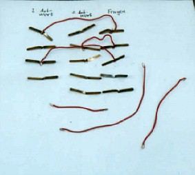 Am anderen Pol der Batterie ist ein Kabel mit einer zwischen-geschalteten Glühlampe befestigt, das mit einer nicht isolierten Öse endet. Diese Öse kann um den stabilen Draht geführt werden.