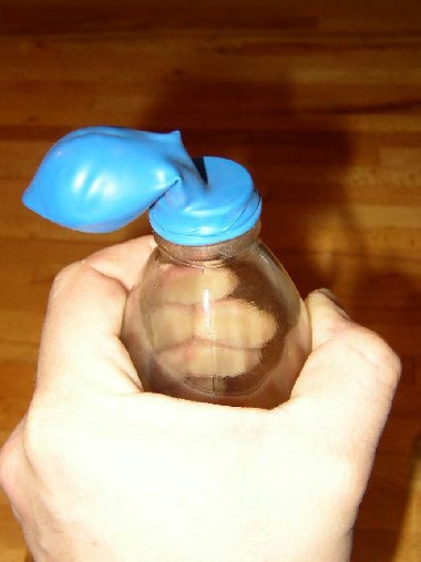 - Ziehe den Luftballon über die Öffnung der Flasche.