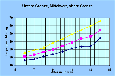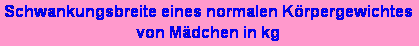 | Alter (in Jahren) | von … kg | Mittelwert | bis … kg | Alter in Jahren | von … kg | Mittelwert | bis … kg | |||||