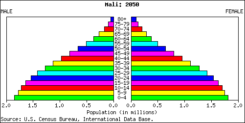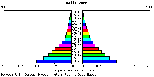 "The population of Mali was approximately 11.7 million in 2005. Sixty-five per cent of the population is under 25 years of age, and 73 per cent of the population lives in rural areas. Life expectancy at birth is 62.2 years for women and 58.8 years for men. The annual population growth rate is 2.9 per cent, and the population doubles every 24 years. Sixty-three per cent of Malians live below the poverty line, and 22 per cent live in extreme poverty." |