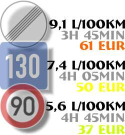 Bei hohen Geschwindigkeiten steigt der Energieverbrauch durch den Luftwiderstand sehr stark an. Bei niedrigen Geschwindigkeiten sinkt zwar der Luftwiderstand immer weiter, aber der Motor wird im Teillastbereich immer schlechter ausgenutzt. Der Wirkungsgrad wird immer schlechter. Der Energieverbrauch lässt sich nicht unter den Verbrauch von ca. 1 Liter pro Stunde im Leerlauf senken. Mit niedrigerer Geschwindigkeit dauert die Fahrt immer länger, so dass dadurch der Verbrauch bezogen auf die gesamte Fahrtzeit und Fahrstrecke wieder ansteigt. |